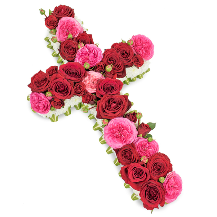 Embrace the charm and uniqueness of our cross-shaped flower arrangement, featuring a delightful mix of white chrysanthemums, rich red roses, and soft pink garden roses. This elegant bouquet is perfect for expressing deep emotions and honoring significant moments.